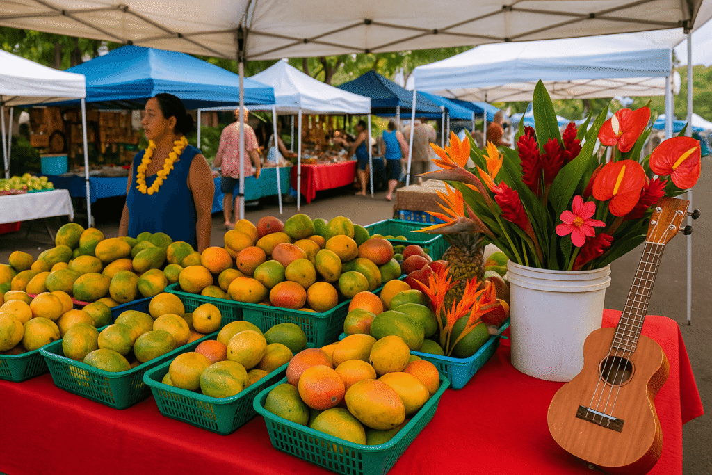 Imaginez : vous flânez entre des étals débordants de mangues, de papayes et de fleurs tropicales aux couleurs éclatantes. Une douce odeur de café fraîchement torréfié flotte dans l’air, un musicien gratte son ukulélé, et un fermier souriant vous propose de goûter à son miel d’eucalyptus. Bienvenue dans un Farmer’s Market hawaïen !